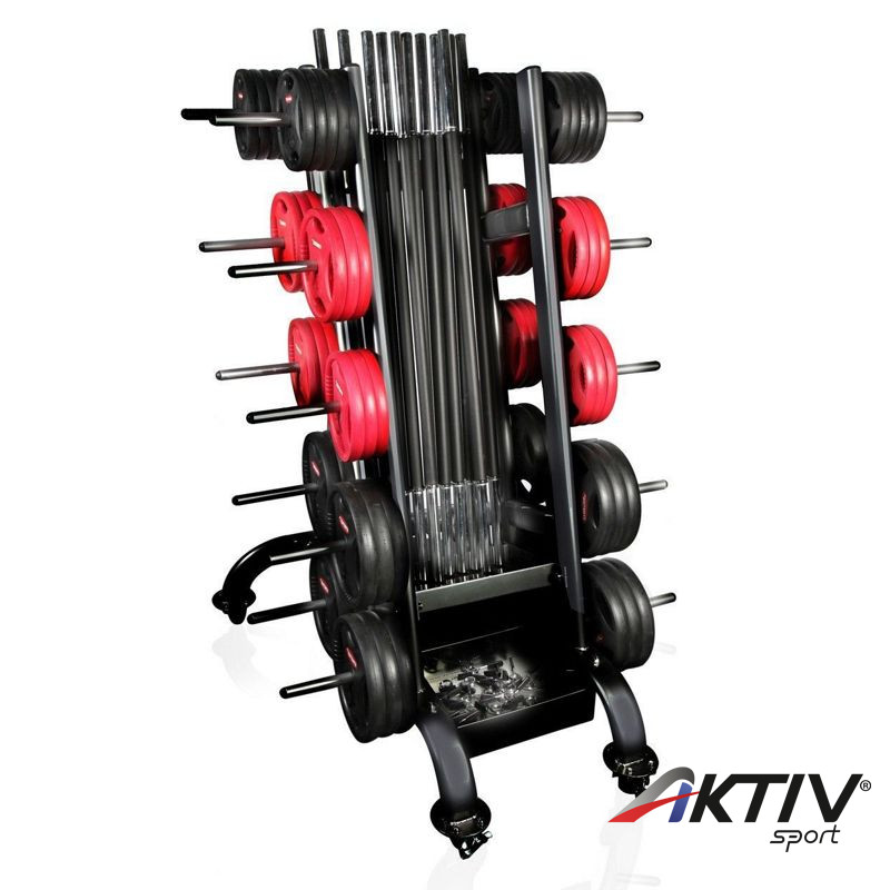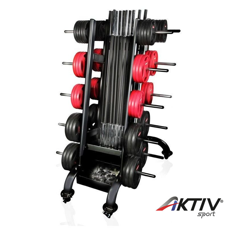 Az állvány oldalán külön tartók biztosítják a súlytárcsák tárolását, az állvány belső része biztosítja a rudak sajátos elhelyezését, a lenti retesz pedig az egyéb kiegészítők tartására alkalmas. Célszerű kialakítása miatt igen helytakarékos, használata logikus, egyszerű. 15 és 30 db-os kiszerelésben kapható.