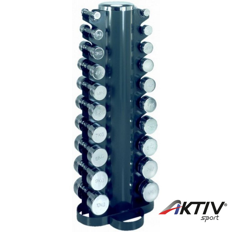 A Tunturi Dumbbell Tower kézisúlyzó tartó tornya 10 pár, 1-10 kg-ig terjedő egykezes kézisúlyzó tárolására alkalmas, minimális helyigény mellett. Legyen szó akár krómozott, gumírozott, vagy neoprén és műanyag egykezes súlyzókról, a Tunturi Dumbbell Tower kézisúlyzó tartó torony lesz az ideális megoldás.