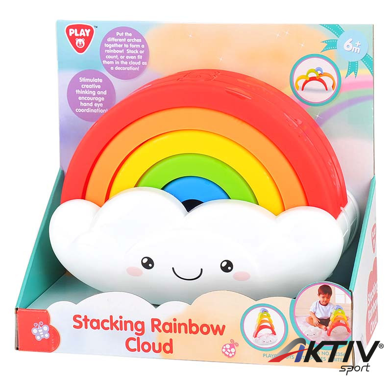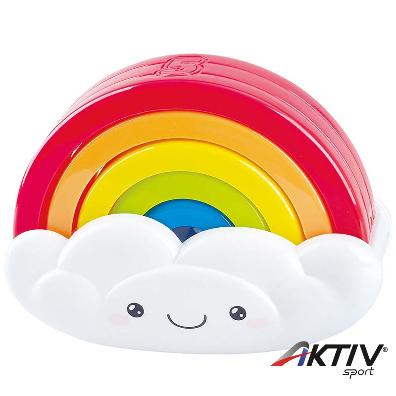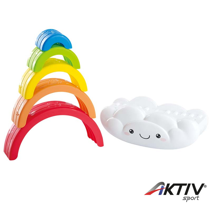 Szivárványos építőjáték 5 különböző színű és méretű híd elemmel, valamint egy mosolygós kisfelhővel.