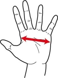 Méret: A megfelelő méret választásához segítséget nyújt, ha lemérjük a tenyerünket a legszélesebb részénél, ahogy az alábbi képen látható: