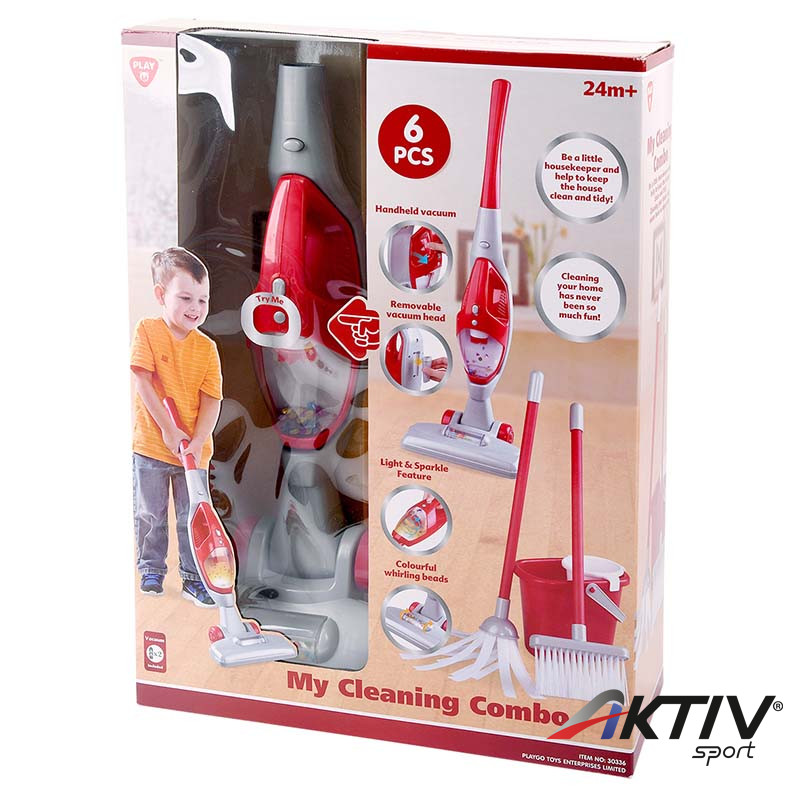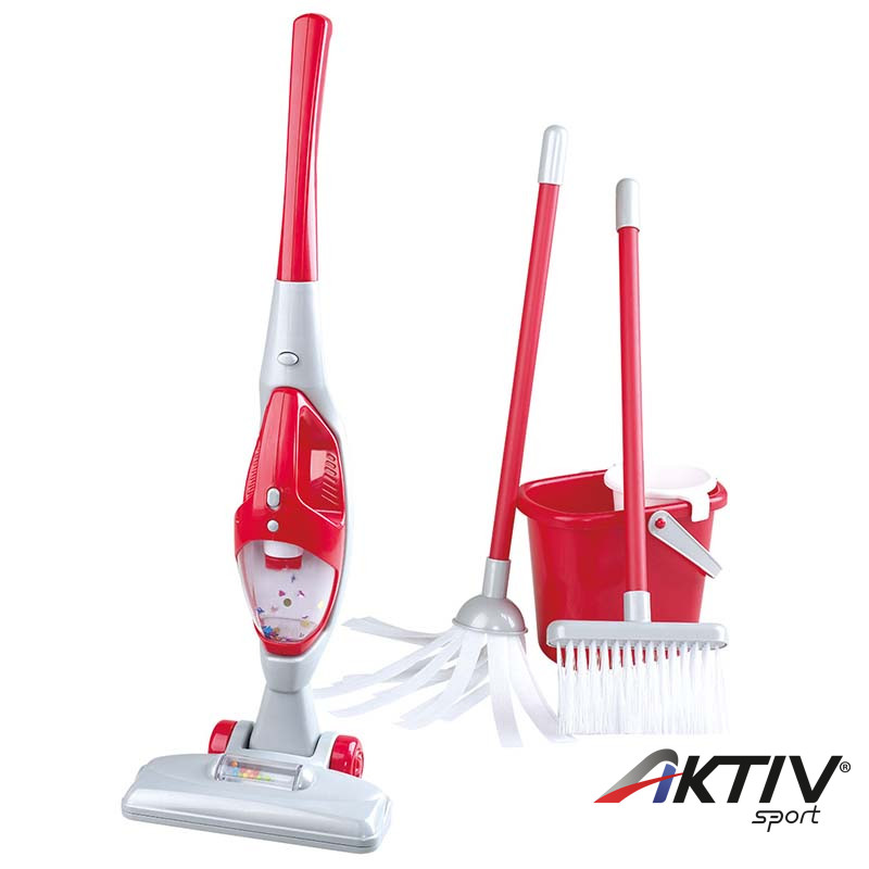 A készlet segítségével játszva tanulhatják meg a gyerekek a takarítást. A készlet tartalma egy seprű, egy felmosó a hozzá tartozó vödörrel és egy 2 az 1-ben kéziporszívó kivehető morzsaporszívó résszel.