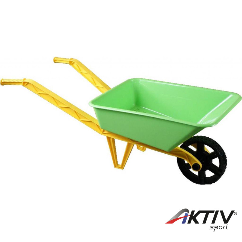 Műanyagból készült talicska zöld színben, amely segíti fejleszteni a gyermekek egyensúlyérzékét.