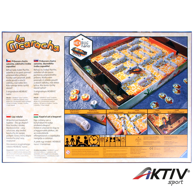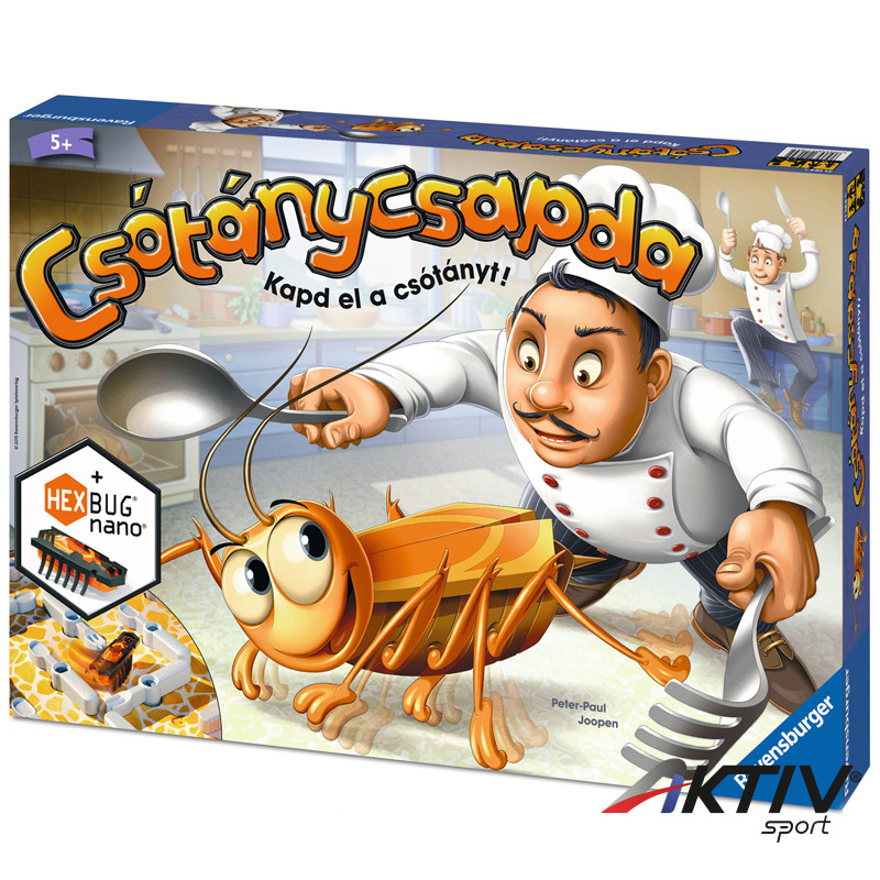 A ronda csótány elszabadult! Kapd el azt a bogarat! Egy csótány van a konyhában, ki tudja először elkapni? A játékosok dobókockával dobnak, és csak bizonyos evőeszközöket forgathatnak el, a csapdák felé terelve a csótányt. Kinek sikerül legtöbbször elkapnia az átkozott rovart? Ha jól taktikázól, nem csak előnyhöz juttatod magadat a csótányt a csapda felé navigálva, de játékostársaidnak is alaposan keresztbe tudsz tenni! Fogd meg minél többször a kis ízeltlábút és nyerj! A Csótánycsapda társasjáték egy eredeti Hexbug Nano robot bogarat tartalmaz. A Csótánycsapda társasjáték tartalma: 1 db Hexbug Nano bogár elemmel és tartalék elemmel, 1 db játéktábla, 24 db evőeszköz, 18 db csótány zseton, 1 db dobókocka, 2 db ajtó, játékleírás. 5 éves kortól ajánlott, 2-4 játékos részére.