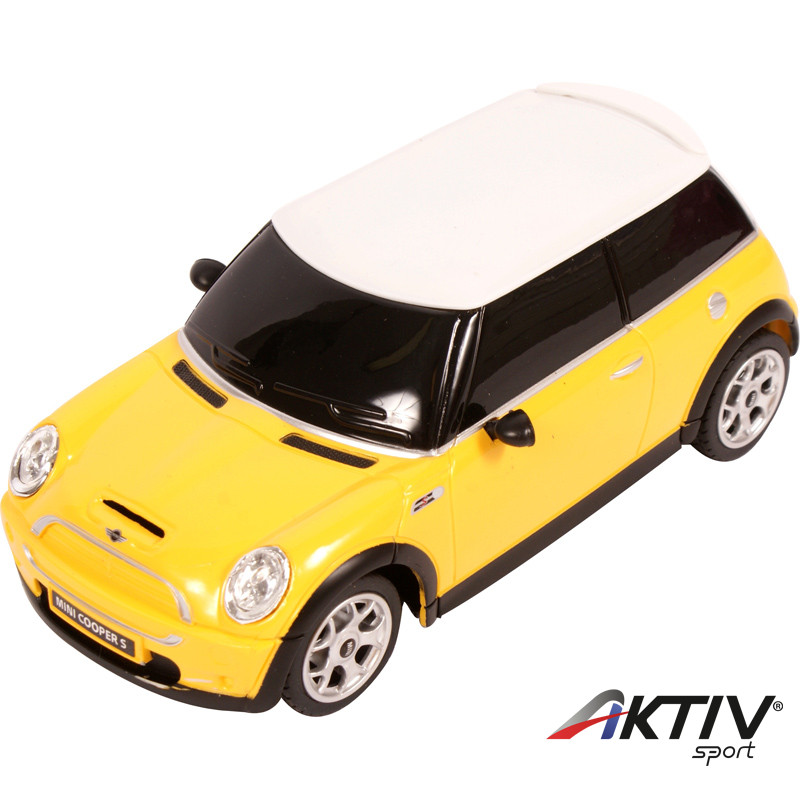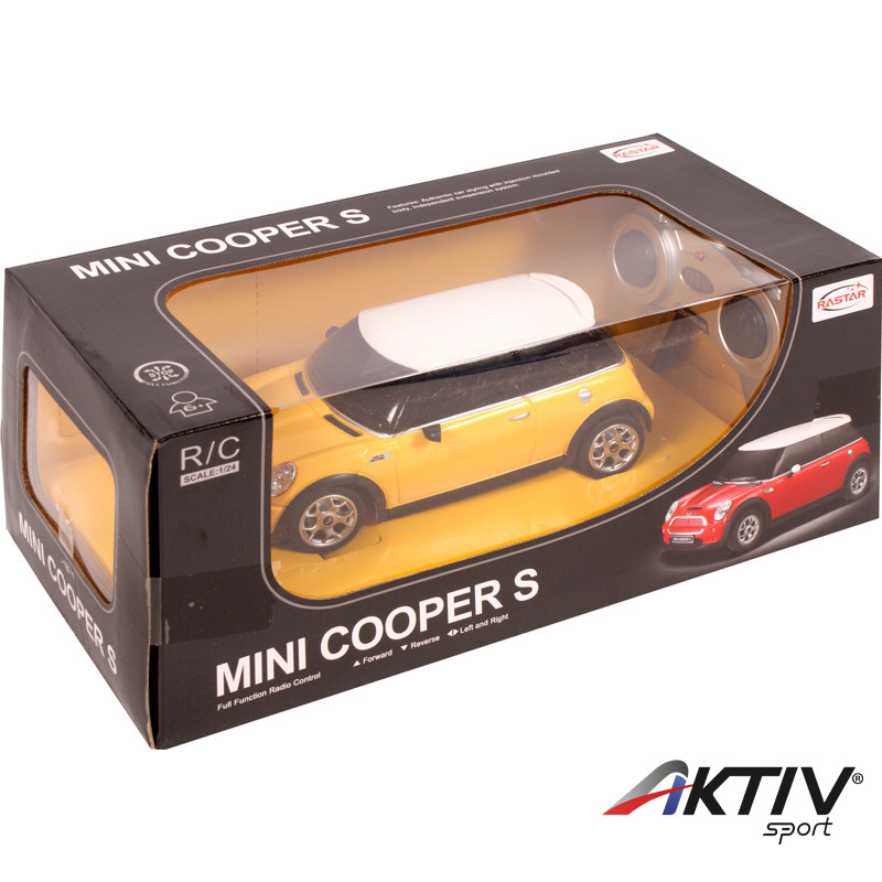 Távirányítós Mini Cooper autómodell, 1:24 méretaránnyal, többféle színben. A Mini Cooper kisautó műanyag karosszériás, nagyon szép kidolgozású, szinte megszólalásig hasonlít az eredeti Mini Cooper autóra, menet közben az autó fényszórói és féklámpái világítanak. A távirányítós autó 13-16 km/h maximális sebességre képes, a távirányító hatósugara 10 m. A távirányító 2 db AA ceruzaelemmel, a Mini Cooper autó 3 db AA ceruzaelemmel működik, a csomagolás az elemeket nem tartalmazza.