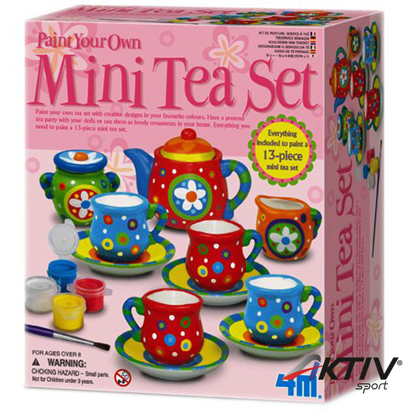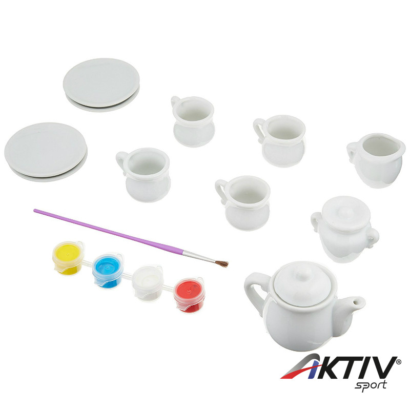 13 db-os mini, kerámia teáskészlet kifestő szett. A teáskészlettel saját mintáit tudod a csészékre festeni. A készletben lévő fehér teáskannát, négy csészét és alátétet, valamint a cukor- és citromtartót is ki lehet festeni. A mini teás szett 3-6 cm-es edényeket tartalmaz, ezért csak játékra használhatók. Segít a gyerekeknek a művészi képességeik kibontakozásában.