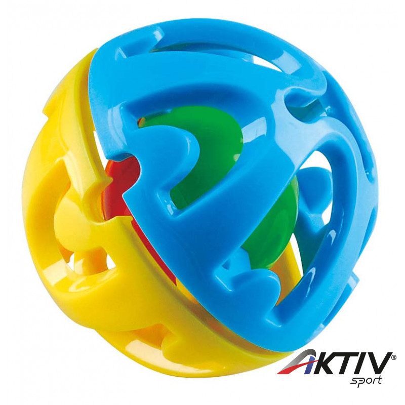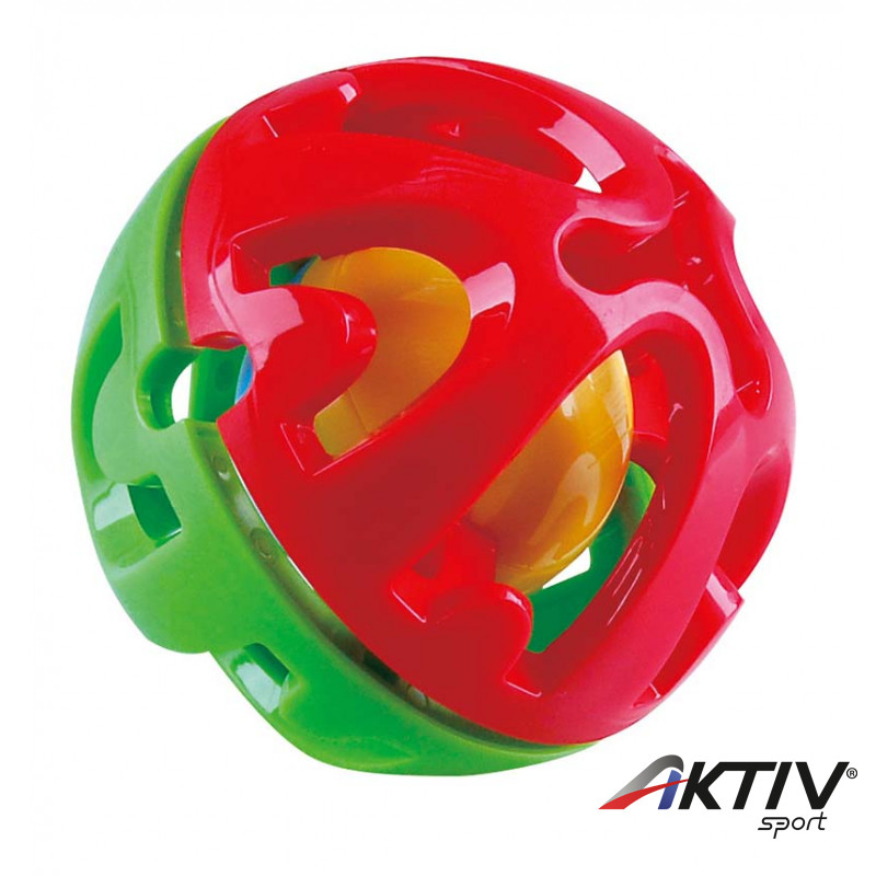 Puha, rugalmas anyagú színes bébi labda, a belsejében csörgő hangot adó kislabdával.