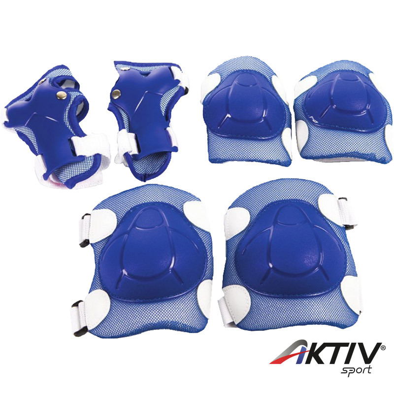 Kék színű térdvédőt, könyökvédőt és csuklóvédőt tartalmazó szett gyerekeknek görkorcsolyázáshoz, gördeszkázáshoz, rollerezéshez, kerékpározáshoz és más egyéb sportokhoz!