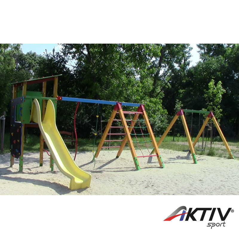 - Anyag: Telített, bélmentes borovi, csúszásmentesített rétegelt lemez, szinterezett acél részek, acélbetétes, vandálbiztos kötél, HDPE műanyag kiegészítők, polyester, beülőkaros csúszda