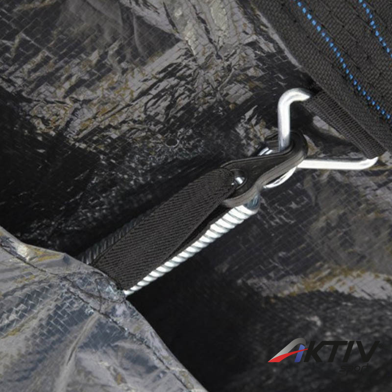 Az esővédő kampós kialakításának köszönhetően egyszerűen felszerelhető a trambulinra, akár a rugóvédő leszerelése nélkül is. Remekül védi a trambulint az UV sugárzás, levelek, por, madárürülék vagy egyéb szennyeződések ellen.