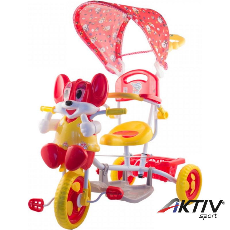 Vidám, fedeles, fémvázas tricikli az elején kedves egér figurával. A tricikli lehajtható napernyővel, kosárral, szülőkarral, lábtartóval és lehajtható biztonsági kerettel rendelkezik.