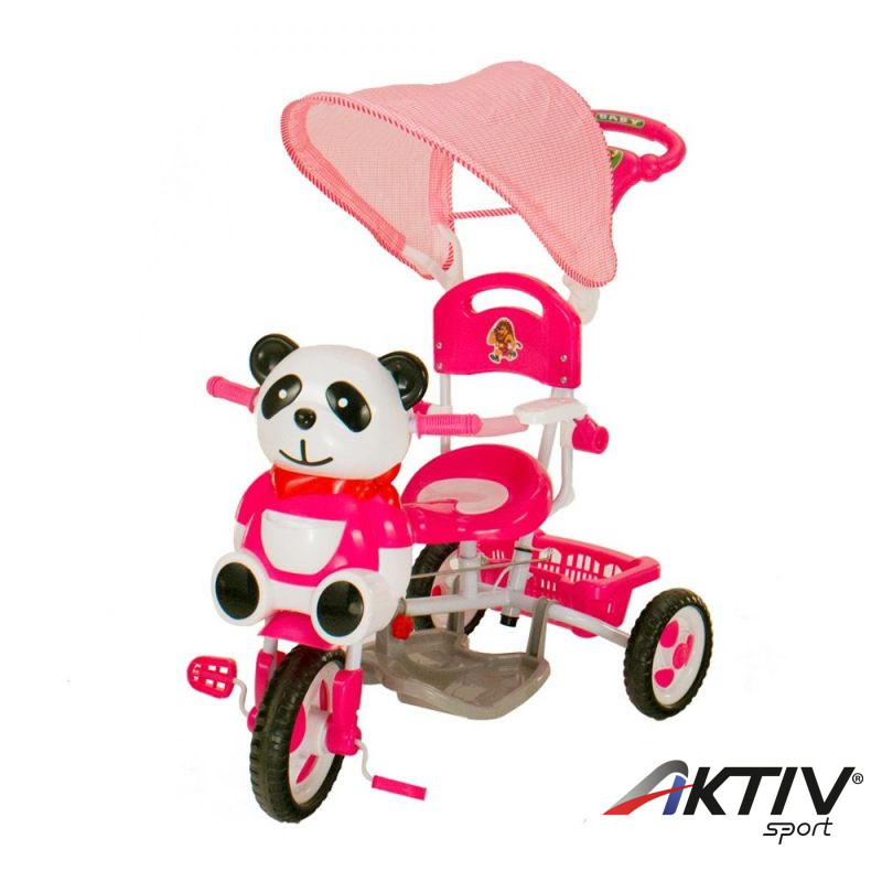 Vidám, fedeles, fémvázas tricikli az elején kedves panda figurával. A tricikli lehajtható napernyővel, kosárral, szülőkarral, lábtartóval és lehajtható biztonsági kerettel rendelkezik. A panda maci fején található gombot megnyomva kedves dallamot játszik.