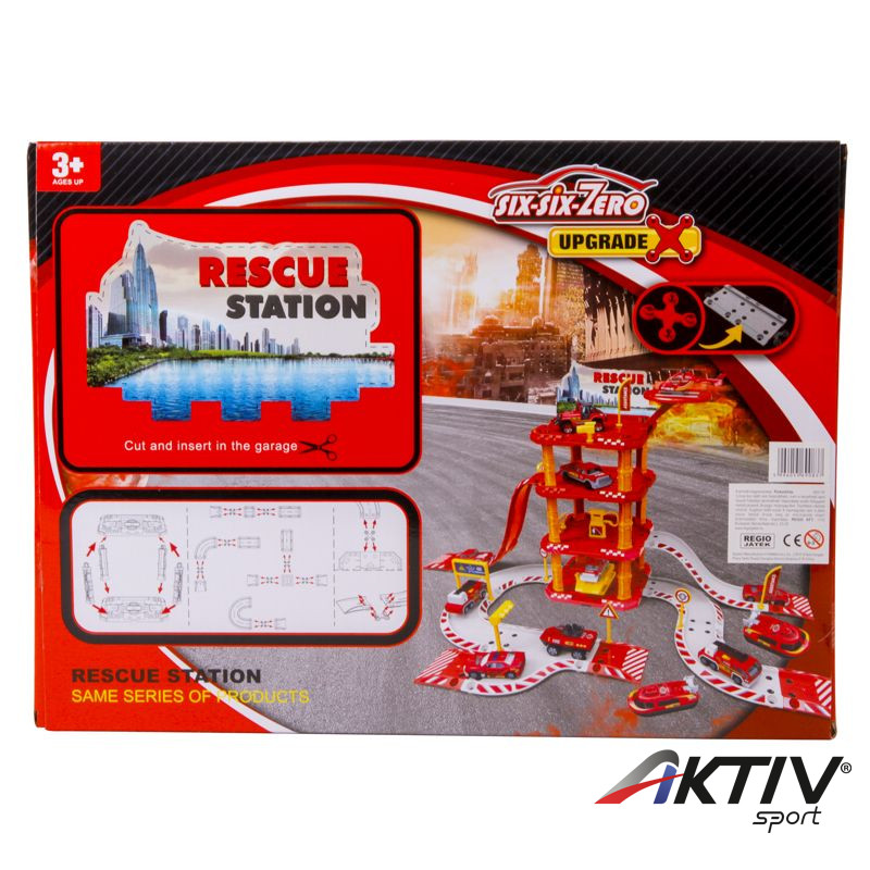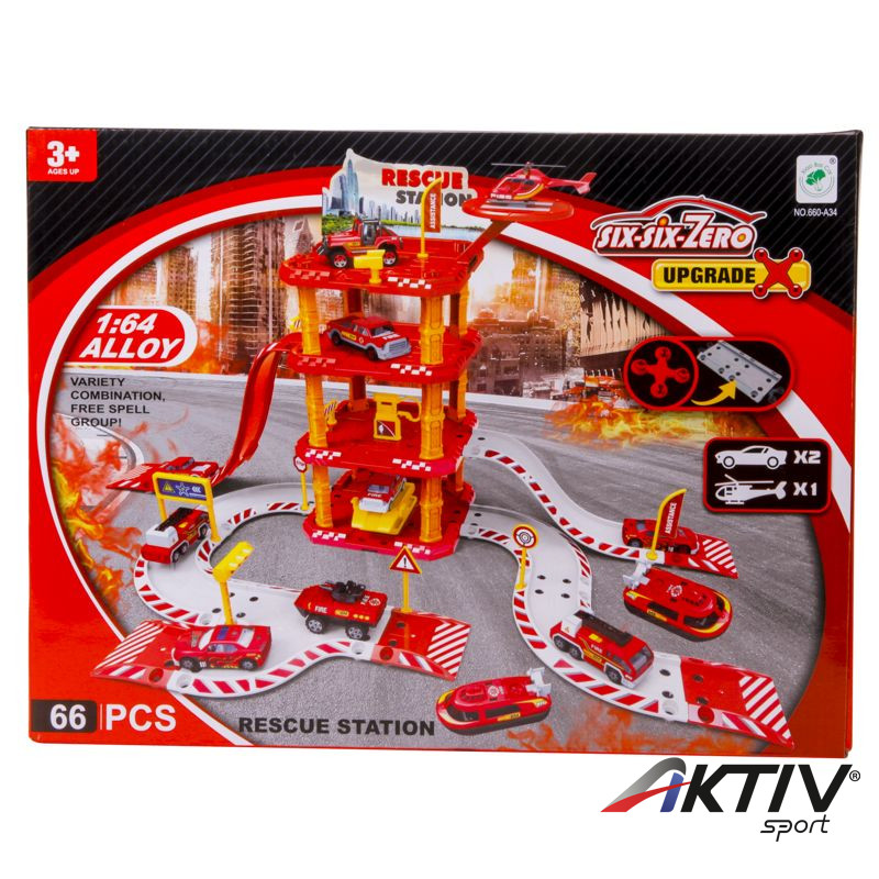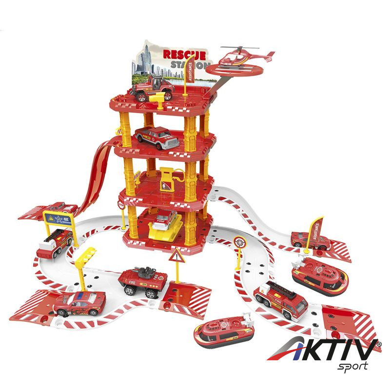 Tűzoltó parkolóház és helikopter leszálló fém kisatóval és tűzoltóval