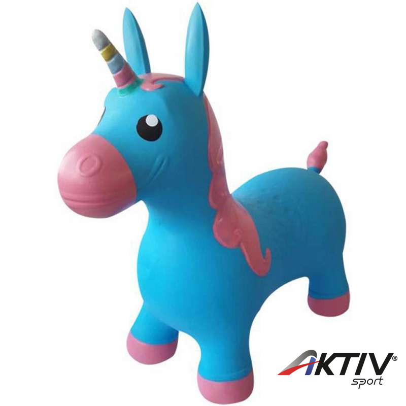 Gumiból készült, felfújható kék unikornis ugrálófigura. Kül- és beltéren egyaránt használható.