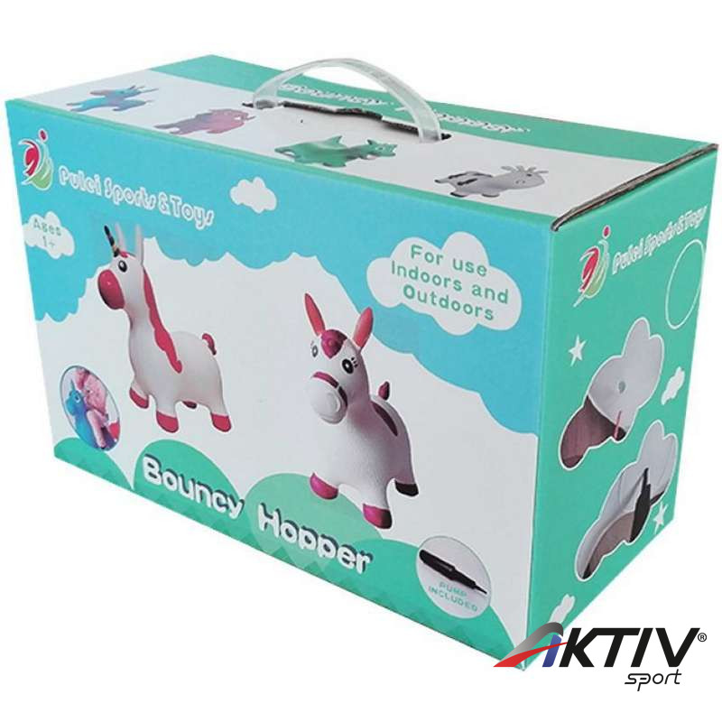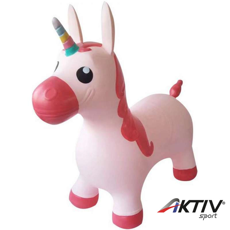 Gumiból készült, felfújható rózsaszín unikornis ugrálófigura. Kül- és beltéren egyaránt használható.
