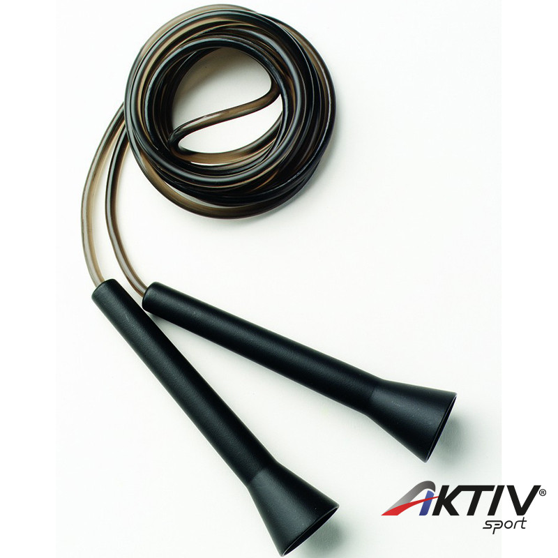 Az ugrókötél öntött, sima markolata és fekete-átlátszó kötéllel készült.