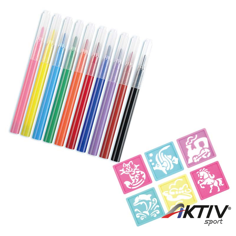 10 db különböző színű utántöltőpatron a kompresszoros tetoválókészlethez 6db különböző, műanyag sablonnal.