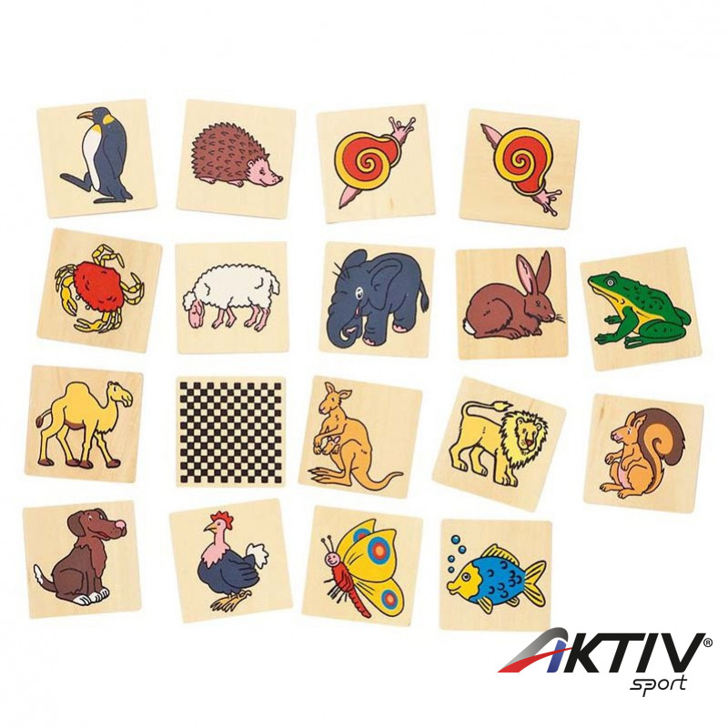 A készlet 32 db (16 pár) fa, 5×5 cm-es színes képet tartalmaz. Fadobozos kiszerelés.