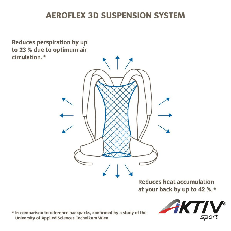 Modern, minden kényelmet kielégítő túrazsák. Mindez köszönhető az Aeroflex felfüggesztési rendszernek. Három irányú szellőzést biztosít A hát és a hátizsák között szabadon áramolhat a levegő. A rugós acélmerevítő biztosítja hogy nehéz teher cipelésekor is megmaradjon a légrés.