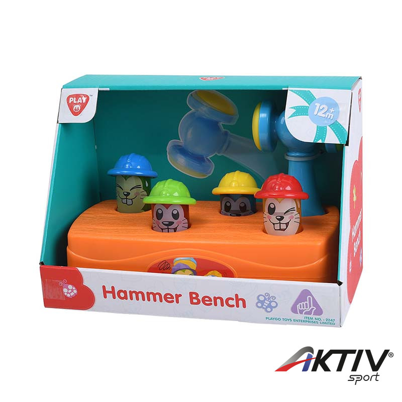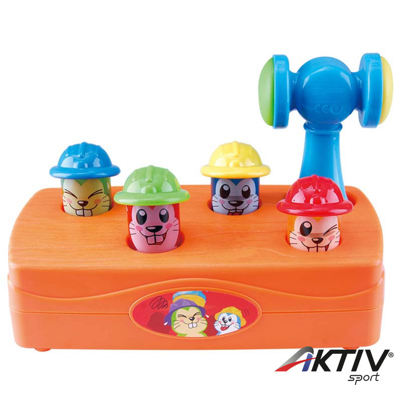Bébi kalapácsjáték, kétoldalú, puha, gumírozott fejű kalapáccsal, vidám hangokkal és dallammal, 4 különböző színű villogó ürge "pop-up" elemmel.