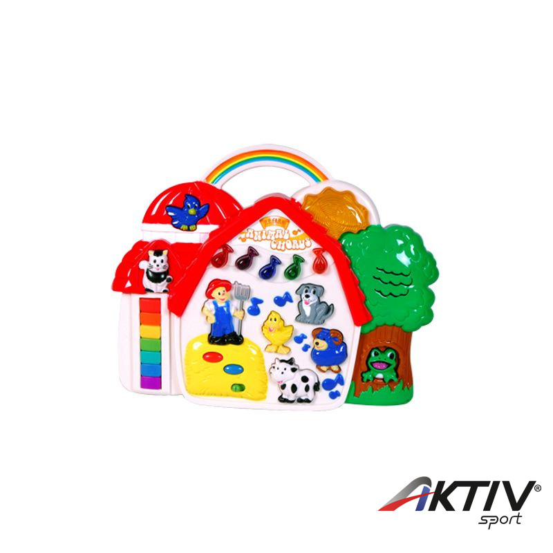 Házikó formájú zenélõ jaték, mely dallamok lejátszásán kívül még állathangokat is tud utánozni.