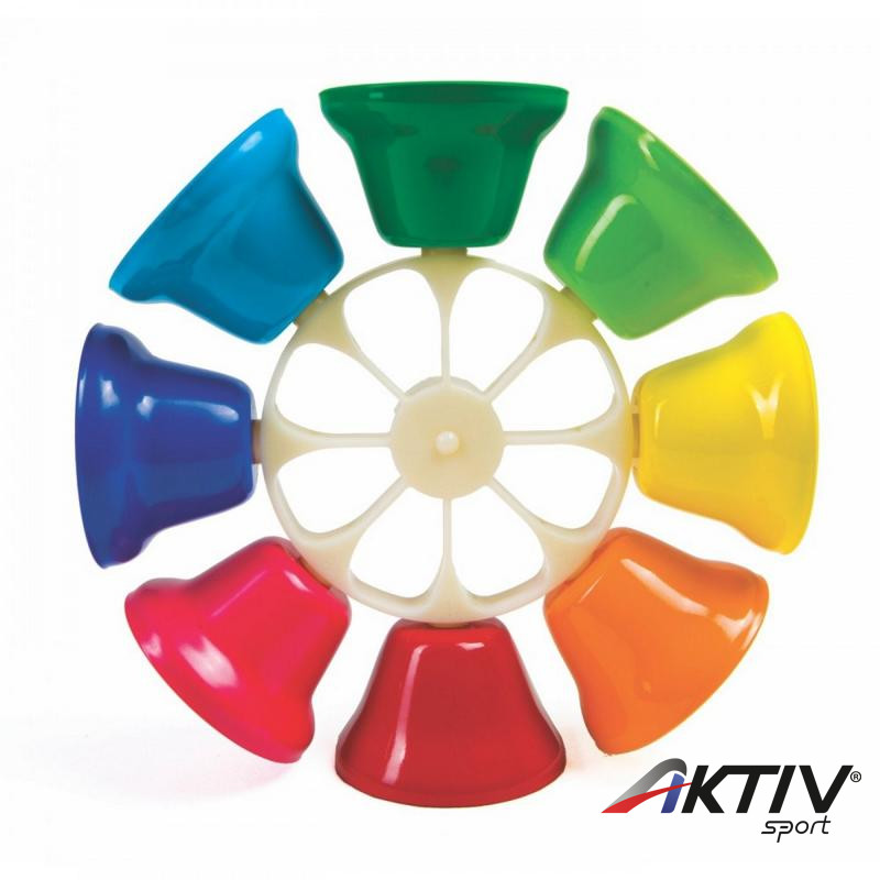Harang készlet 8 különböző hanggal, különböző színekben egy műanyag keréken.