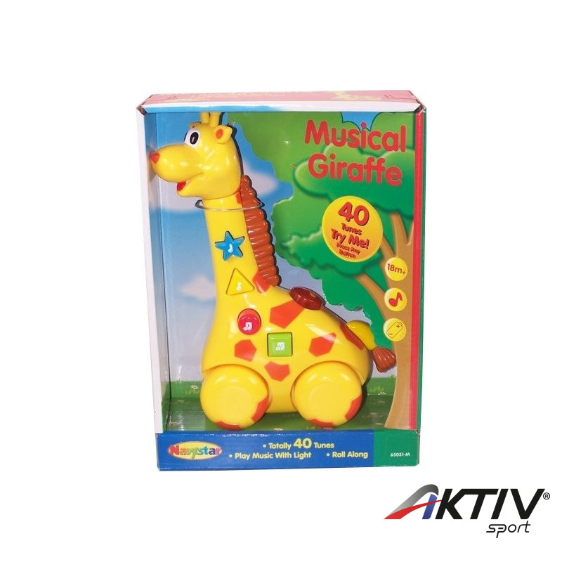 Babáknak készült mûanyag zsiráf, mely 40 dallamot játszik, világít és gurul, ha az 5 színes gomb közül bármelyiket megnyomják.